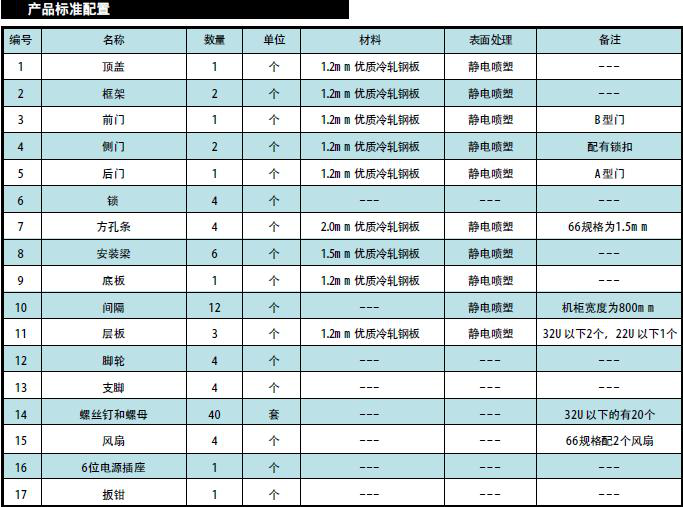 板材种类、涂层材料、加工工艺决定了机柜的稳定性。一般它的长度规格有600,800mm ,宽度规格有600,800,1000mm ,高度规格是42U,36U,24U。早期所用的机柜大都是用铸件或角钢经螺钉、铆钉连接或焊接成机柜框架,再加由薄钢板制成的盖板(门)而成。这种机柜的体积大、笨重、外形简陋,已被淘汰。随着晶体管、集成电路的使用和各种元器件的超小型化,机柜的结构也向小型化、积木化方向发展。机柜已由过去的整面板结构发展成为具有一定尺寸系列的插箱、插件结构。插箱、插件的组装排列方式分水平排列和垂直排列两类。机柜材料普遍采用薄钢板、各种断面形状的钢型材、铝型材及各种工程塑料等。机柜的框架除用焊接、螺钉连接外,还采用粘接工艺。