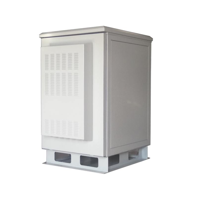 该机柜主体结构采用镀锌钢板(钣金厚度1.5-2.5mm),客户可以根据需求采用其它材料;机柜内部设计为双层钣金三明治结构形式的隔热结构,机柜壁和门的隔热材料厚度21mm,机柜顶隔热材料厚度42mm。左右侧壁可以移除,方便安装内部设备和布线;内部机架配套有可拉出的抽屉,抽屉滑道可负载100kg。门装800W制冷量空调器可用来换热,保证内部设备的正常运行。机柜表面喷有户外型粉末,防护等级为IP55。