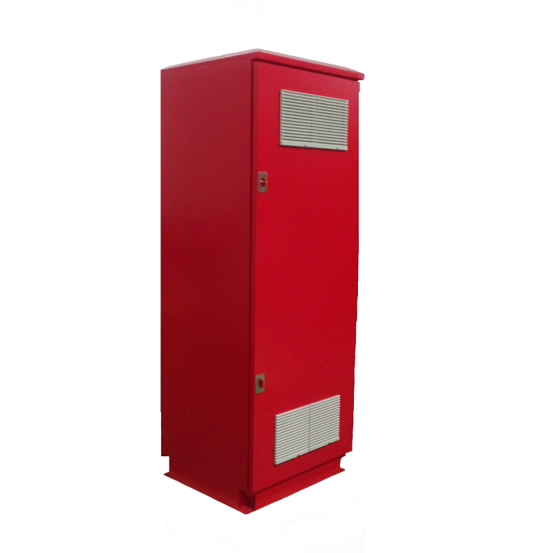 该机柜主体材质为1.5mm厚镀锌板,外形尺寸为W650*D600*H1800mm,设备舱空间为25U 19英寸机架,机架深度400mm,机架至门内侧距离100mm,电池仓空间高度H330mm。门装风扇窗,其中4个12038轴流风扇(风扇使用48VDC电源);内部照明采用的是T5*300型4WLED灯管,照明控制由门控行程开关控制,开门灯亮,关门灯灭。机柜内部配置了设备托架2对,7位PDU1个;附 件有:M6机柜螺钉和弹卡螺母20套, 过线橡胶圈10个。机柜外表面喷涂有户外型粉末RAL2002,防护等级为IP54。