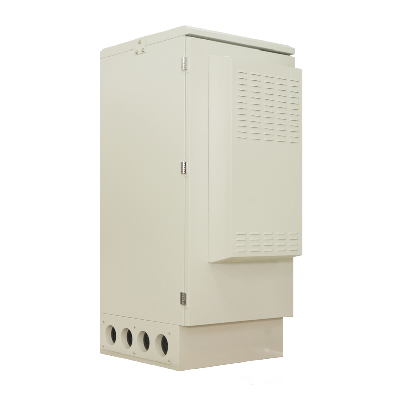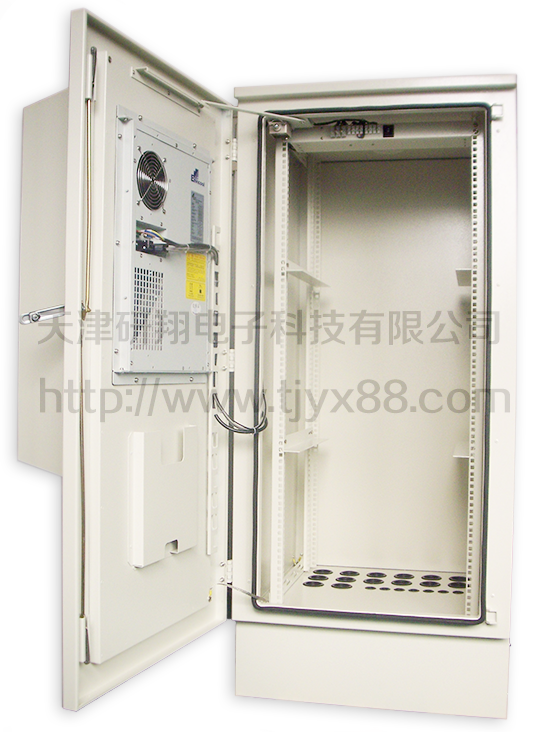 该机柜主体结构采用镀锌钢板(钣金厚度1.5-2.5mm),机柜内部设计为双层钣金三明治结构形式的隔热结构;机柜壁和门的隔热材料厚度21mm,机柜顶隔热材料厚度42mm;机柜基座侧壁配置4个多孔进线窗。表面喷涂户外型粉末,有较好的防光、防潮等特性。