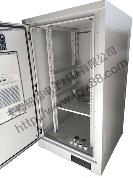 机柜主体结构1.5mm厚,基座2.5mm厚,以镀锌钢板为整体材料。外形尺寸为W800*D800*H1400mm (计入门装空调器厚度,最大深度为950mm),外表喷涂户外型粉末,有较好的防光防水防锈等特性,防护等级达到IP55。该机柜的内部配置为L托架2套, 层板1个,采用4W-LED灯管(由门禁传感器开关控制)照明;底底板装塑料线缆索头3个PG11、2个PG29、2个PG19可供线缆进入。机柜安有前后两门,前门安装空调器、连杆锁,同时还有应急通风散热:前门上部安装有轴流风扇一个,机柜底板有过滤通风窗,可以有效的控制机柜内部温度,保证机柜内部设备正常运行。