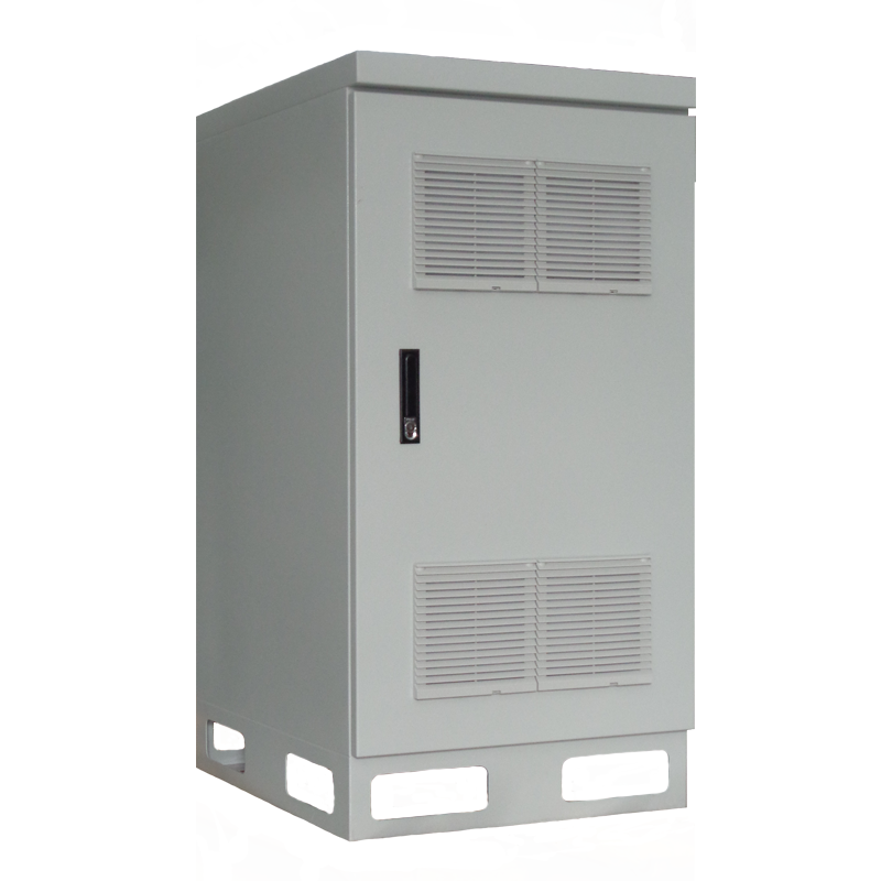该机柜主体结构镀锌钢板(钣金厚度1.5-2.5mm),客户可以根据自身需求采用其它材料定制。机柜内部为双层钣金三明治结构形式的隔热结构,机柜壁和门的隔热材料厚度21mm,机柜顶隔热材料厚度42mm。机柜门装2个轴流风扇(带有过滤窗)和2个进风过滤窗,有较好的散热系统。并且机柜内部有LED照明,其中包括有4W-LED灯管,由门禁传感器开关控制,机柜表面喷有户外型粉末,防护等级为IP54。