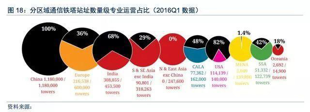 根据TowerXchange数据,截至2017年底全球通信铁塔站址共约440万,其中由专业铁塔公司运营的297万,相比2015年底分别提升约100万/92万。从全球看,将铁塔从通信运营商分拆专业化运营成为主流趋势,目前仅有1/3铁塔留在运营商资产负债表上。从20世纪90年代开始,美国运营商逐渐放弃铁塔站址控制权,独立第三方公司得以快速发展,目前美国本土约有100家铁塔公司,仅有约10%的铁塔资源被运营商直接持有。从21世纪开始,印度运营商加快将存量铁塔出售给合资公司,目前超过70%铁塔专业化运营。