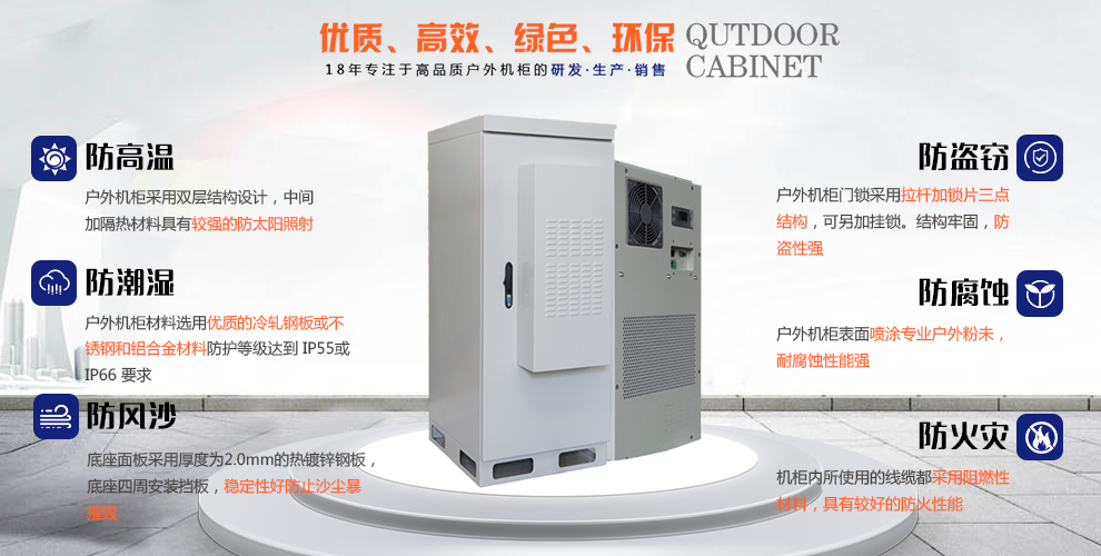 在对户外机柜进行涂层是,应当注意涂层表面应该连续、均匀、纹理与相应的标准样板保持一致,且不会出现并且无结瘤、缩孔、起泡、针孔、开裂、剥落、粉化、颗粒、流挂、露底、夹杂脏物等缺陷。这样表面涂层完好无损,才能更好使户外机柜可以适应户外各种环境。